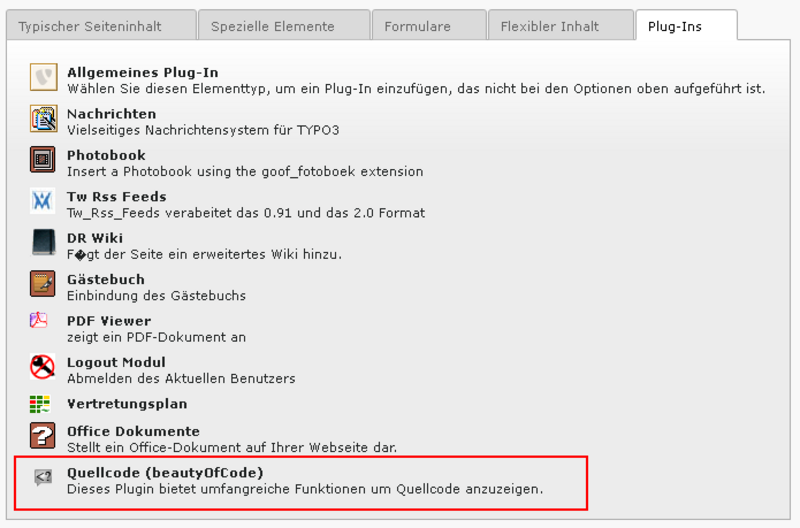 Zur Einbindung von Quelltext nutzen Sie unter den Inhaltselementen Plug-Ins eine Extension mit dem Namen "Quellcode (beautyOfCode)". Mit diesem Inhaltselement ist es möglich, Programmiercode der verschiedensten Art in einer nichtproportionalen Schrift übersichtlich darzustellen. Dabei lässt sich sogar eine Zeilennummerierung dazu- oder abschalten. Hier ein Beispiel