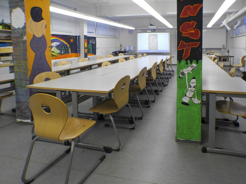 Jede Klasse gestaltet ihr eigenes Klassenzimmer. Auf jeder Etage steht ein Medienwagen mit Laptop und Beamer für den Einsatz im Unterricht bereit.